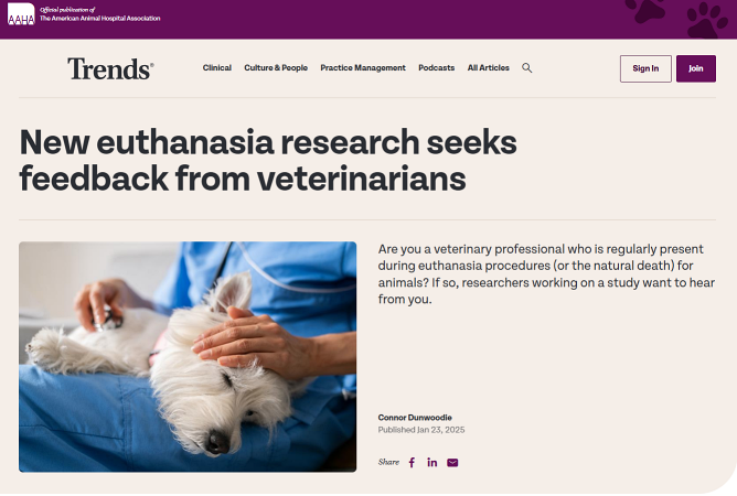 We've concluded our survey, "Time of Death Experiences During Veterinary Euthanasia Procedures," after receiving over 600 responses. Thanks to Dr. Ken Gorczyca, Dr. Kathleen Cooney, and Dr. Lori Kogan for promoting the survey at veterinary conferences, in an article for the American Animal Hospital Association (AAHA), and in an interview on The Pet Loss Companion podcast. We plan to publish the fascinating results of this survey in a peer reviewed scientific journal.